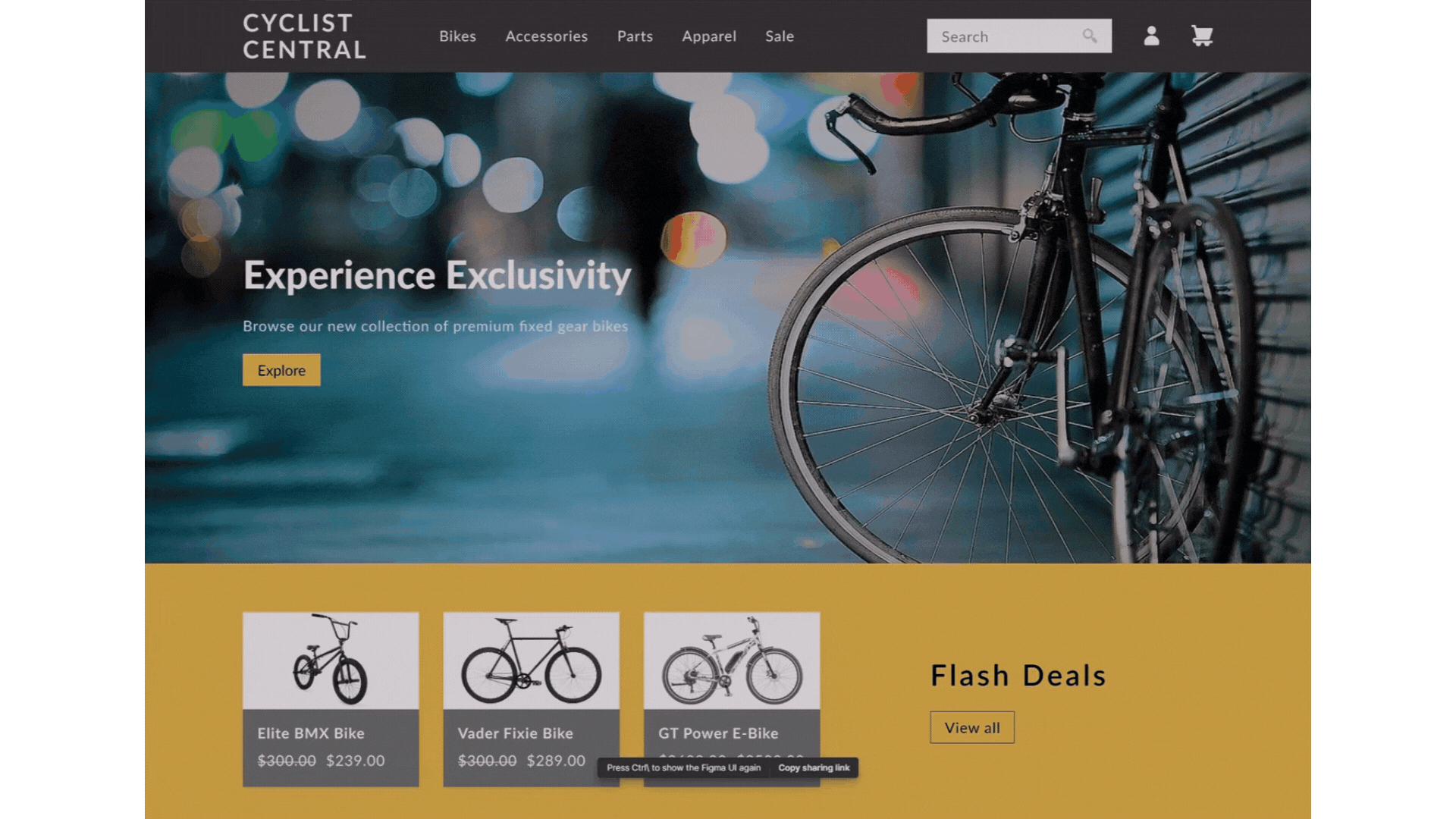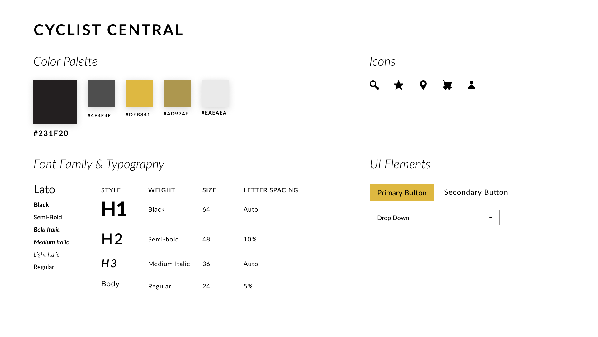Cyclist Central has a brand that prides itself in being an expert in the biking field. Their brand attributes are savvy, focused, serious, and dependable. To reflect this branding, I decided to use a black and gold color palette when designing. Black and gold are both associated with prestige and trust which can communicate to customers that Cyclist Central is a reliable and high-quality brand. User interface elements such as buttons did not have any rounding to show that Cyclist Central is serious about what they do.