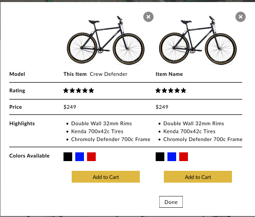 To get ideas on how to implement these features into Cyclist Central’s website, I looked and studied other e-commerce websites that have similar features offered. Websites such as Amazon and Best Buy allow users to compare similar products within a product’s page and Trekbikes allows users to include any four products into a comparison table. Best Buy and Trekbikes also offer a guest checkout.
