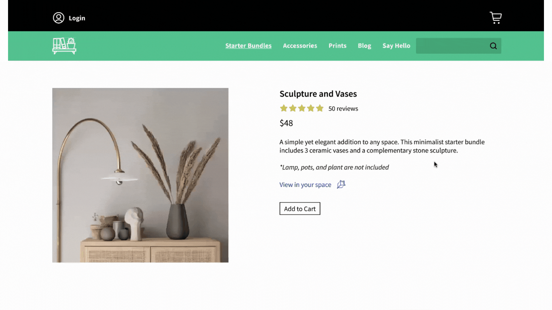 The prototype also allowed customers to go through the motion of viewing an item in their room. From the bundle detail page, they can select the View in your Space option which leads to a pop-up window. In this window, customers can upload a photo of their space or do it live with a camera.